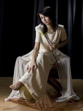 Молодая худышка в красивом белье показывает стриптиз на кресле